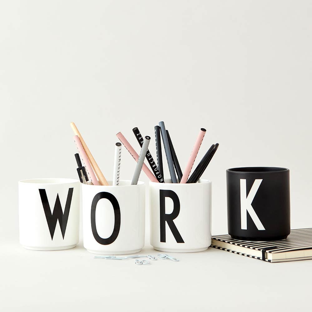 Die Porzellan Becher von Design Letters tragen die Typografie vom dänischen Designer Arne Jacobsen. Obwohl 1937 entworfen, ist die Typografie heute so passend wie vor über 70 Jahren.