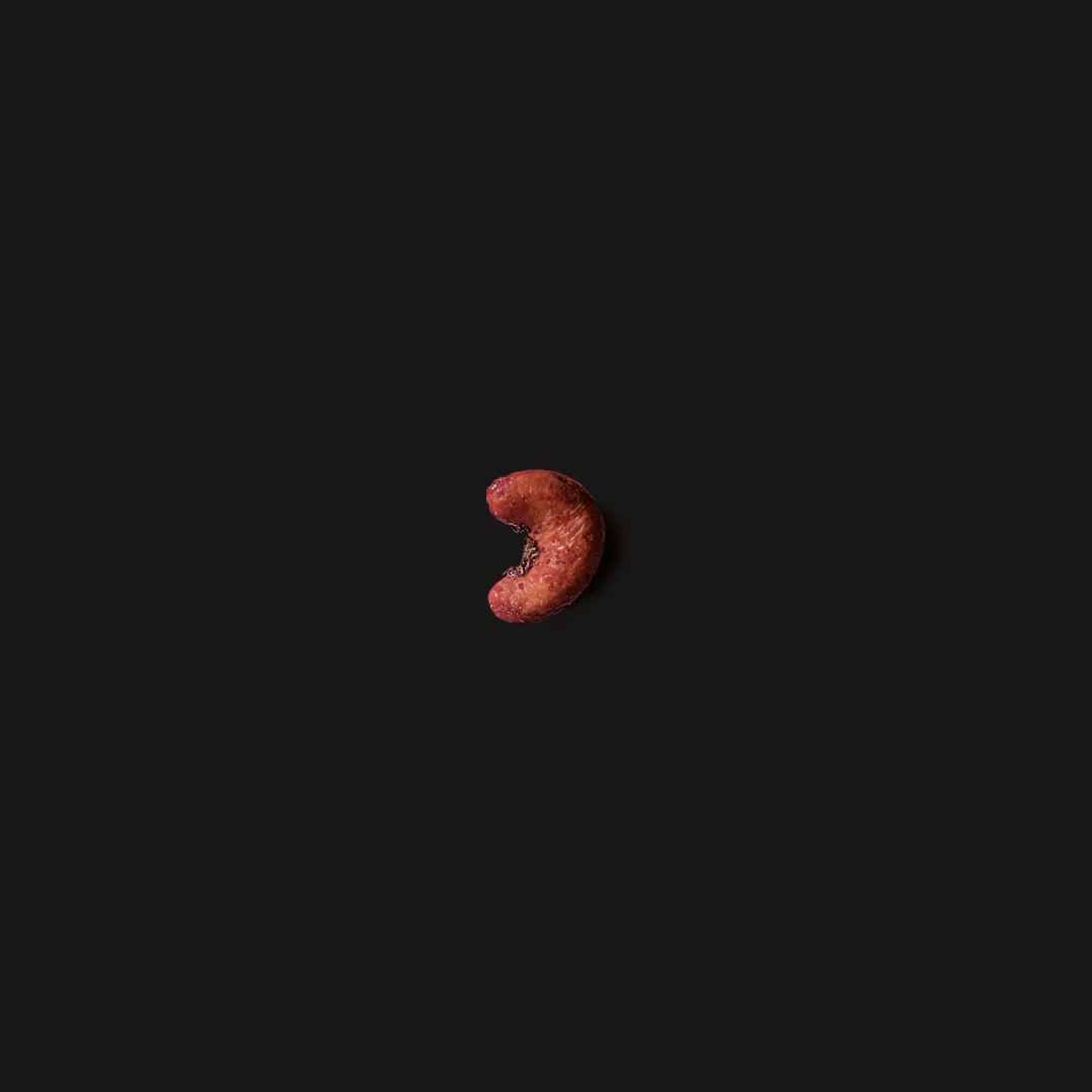 Cashewkerne (96,11%) geröstet, gewürzt mit Thymian (1,22%), Tomatenmark (1,47%), Salz (0,81%) und Rote Beete Pulver (0,39%)