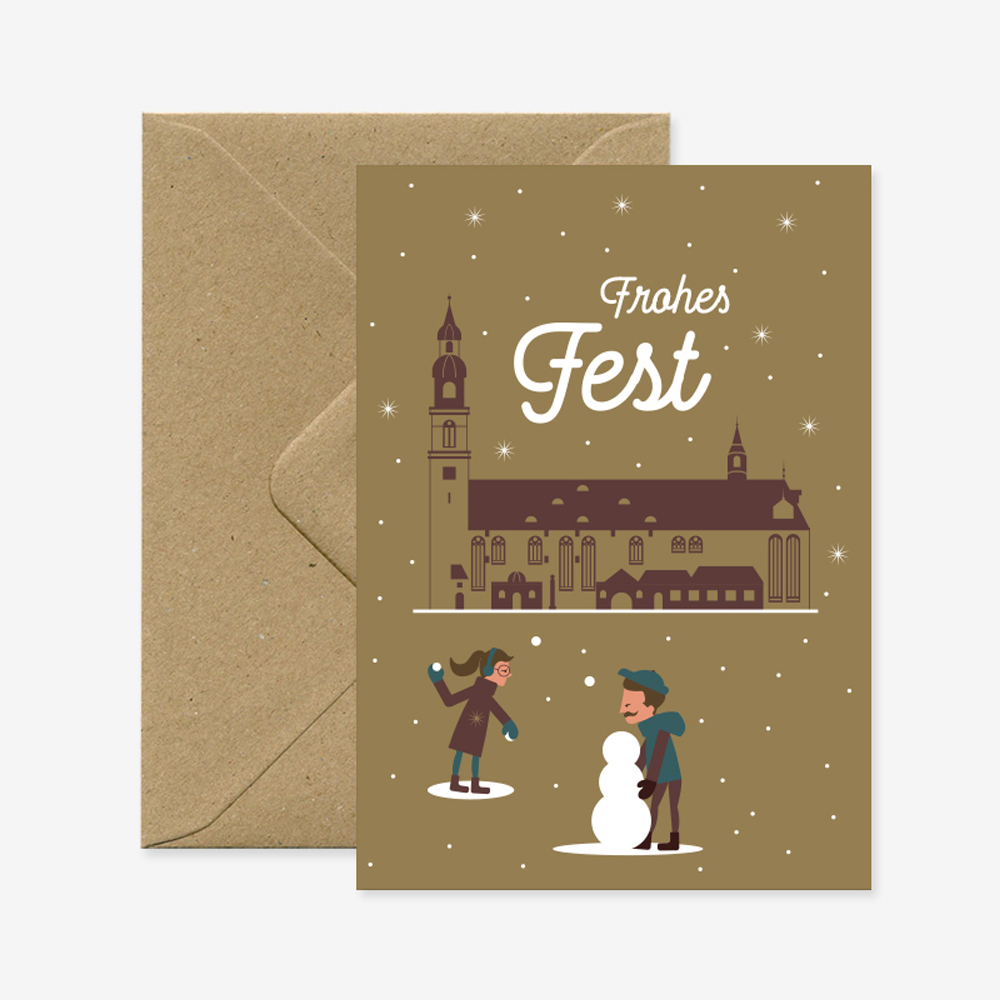 Unsere Weihnachtskarte „Frohes Fest Stadtkirche Celle“ zeigt unsere wunderschöne Stadtkirche auf der Stechbahn zur Weihnachtszeit. Es schneit und zaubert eine festliche Atmosphäre auf den Platz. Hier werden Schneemänner gebaut und Schneeballschlachten genossen.