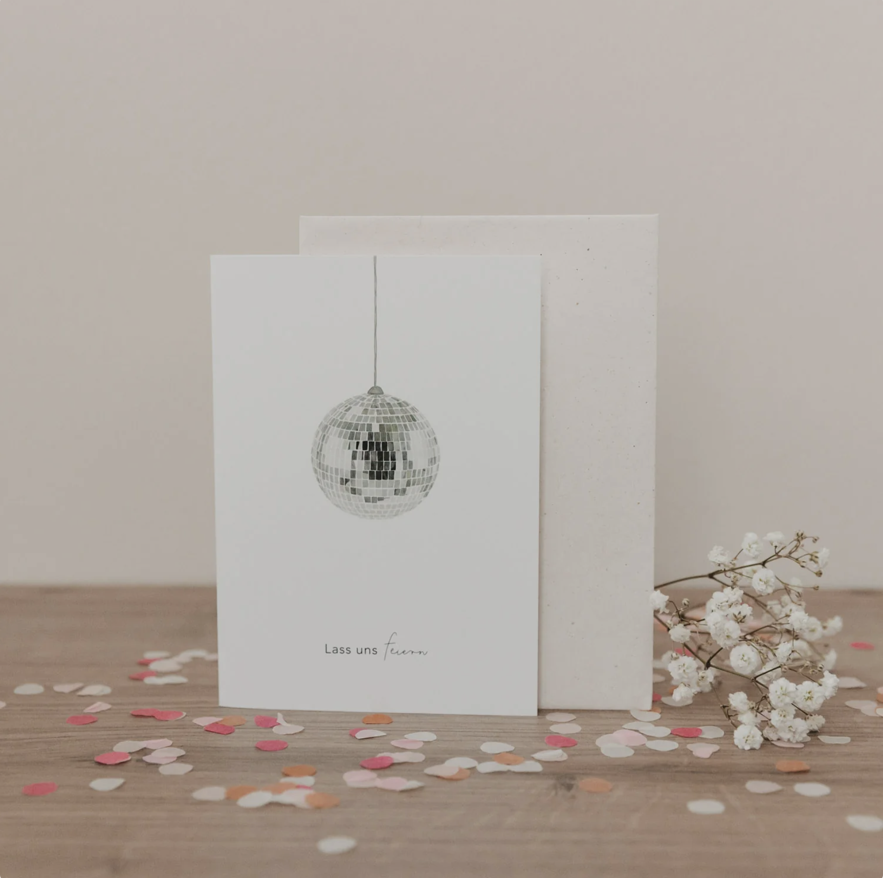 Die stilvolle Illustration einer glänzenden Diskokugel versprüht pure Feierlaune und macht die Karte zum idealen Begleiter für jedes Geschenk. Dank ihres festlichen Designs eignet sie sich auch hervorragend als Einladungskarte für unvergessliche Feiern.