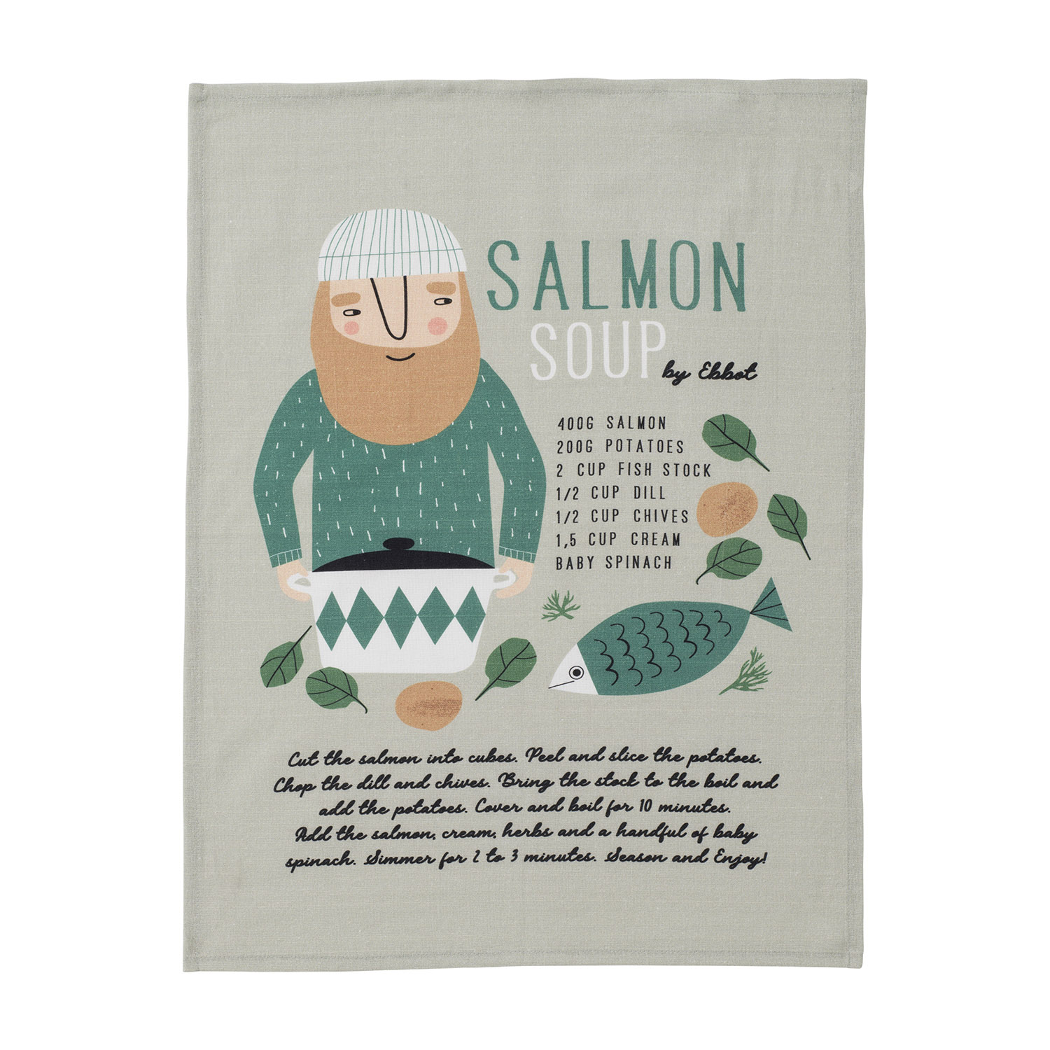 Wunderschönes und witziges Geschirrtuch Ebbot mit Rezept für Lachssuppe – farbenfroh und witzig. Das ideale Geschenk – bringt einfach gute Laune nach Hause und unterwegs 🙂