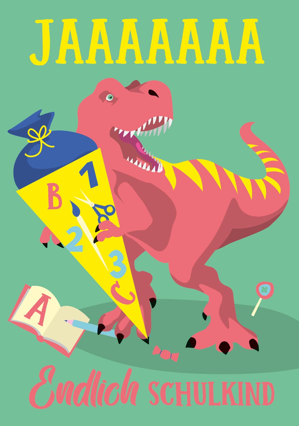 Coole Postkarte „Endlich Schule Dino“ von nobis design. Eine besondere Art Deinen Lieblingsmenschen zu schreiben – für gute Laune. Eine Statement Karte.