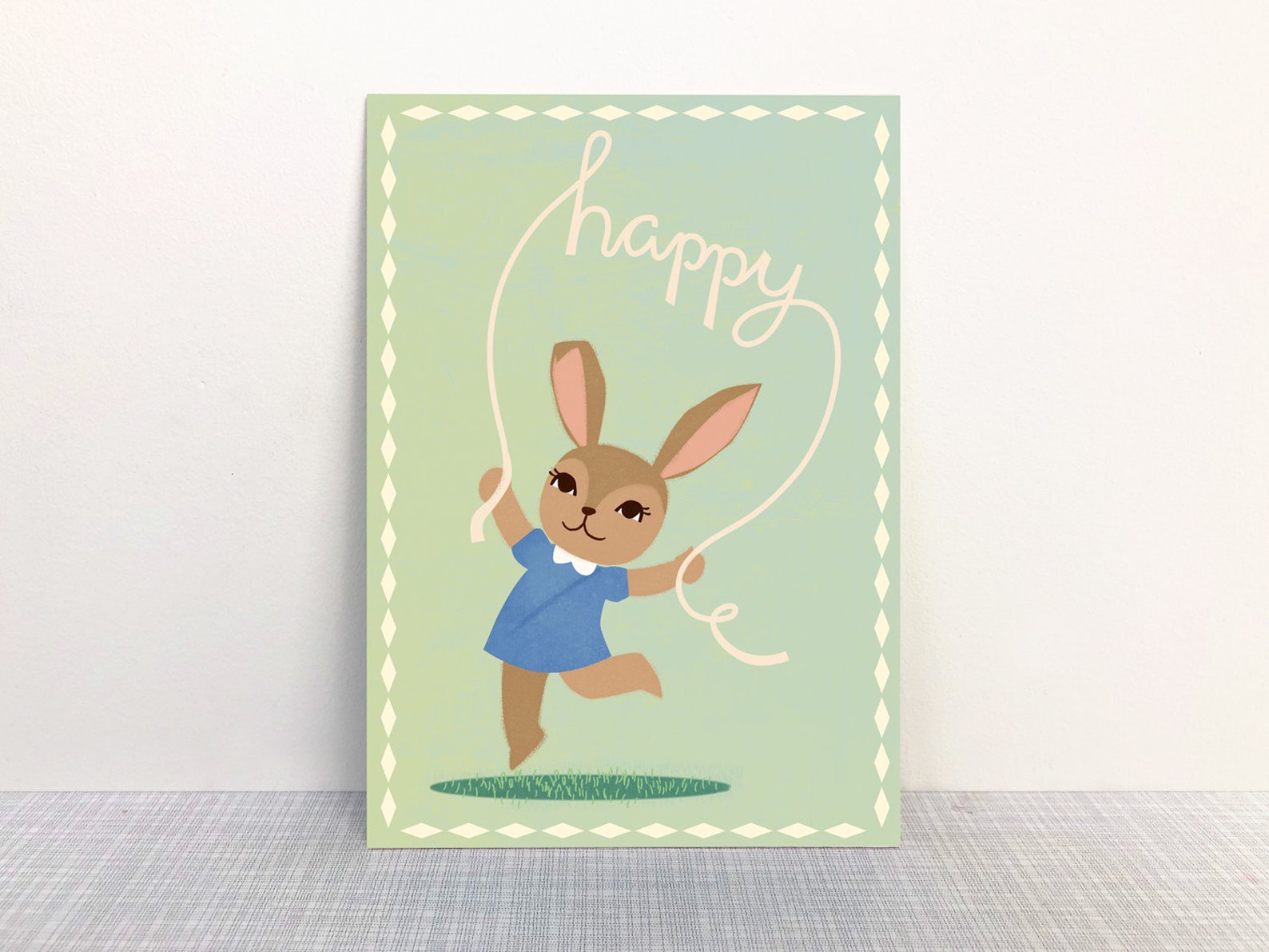 Wunderschöne Postkarte mit fröhlichem Happy Hasen mit Springseil von MONIMARI. Eine hübsche Frühlings-Postkarte für wundervolle Ostergrüße.