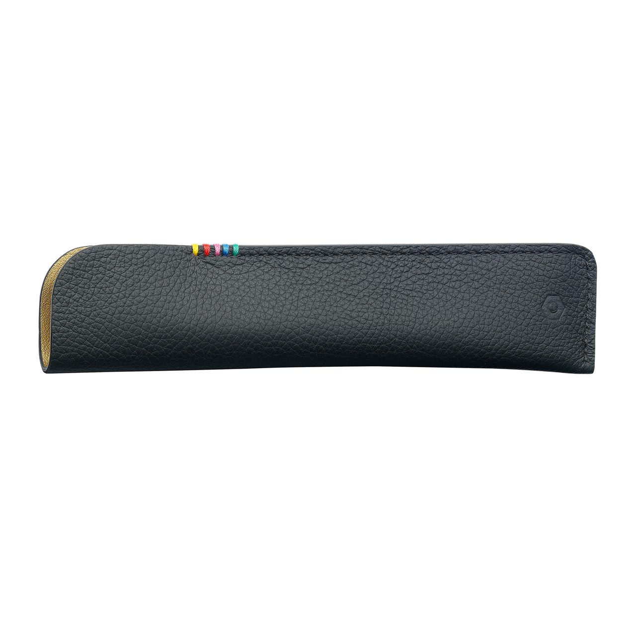 Schwarzes genarbtes Kalbsleder mit vergoldeter Innenseite, 5 Nähte in den Farben des Regenbogens zieren die Außenseite