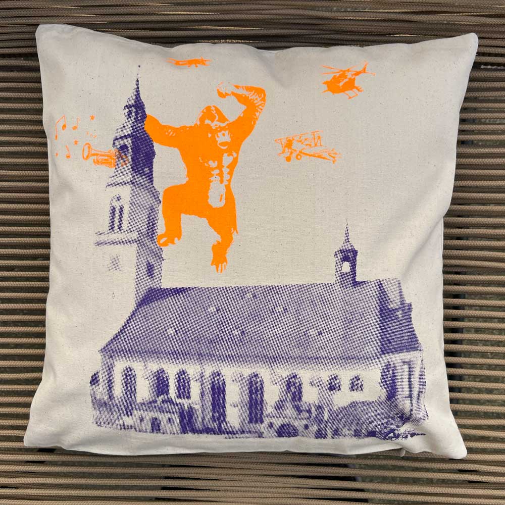 Wunderschönes Kissen mit Motiv „Kirch Kong“ in Neonorange und Violett von Allernixe im Siebdruck gedruckt. Auch ein schönes Geschenk oder Mitbringsel aus Celle.