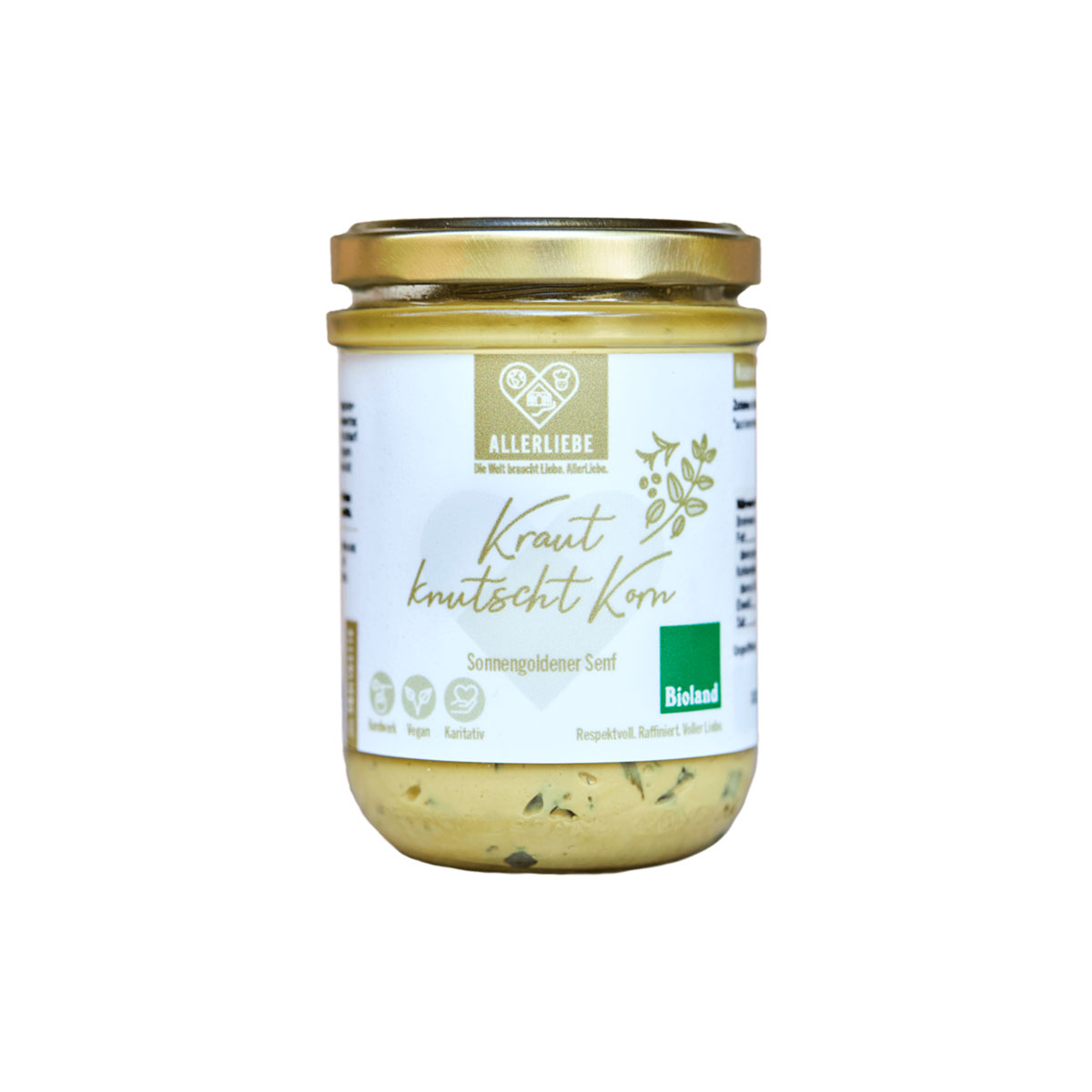 Wenn sich duftige Kräuter in korngesprenkelten Senf betten, in goldigen Honig tauchen vom Saft rotwangiger Äpfel betören und mit Cayenne Pfeffer bestäuben lassen, beginnt eine spannende Liaison. Scharf auf Röstaromen stürzt sich unser Senf kornüber auf Ihr köstliches Grillgut. Genuss ist AllerLiebe Anfang.