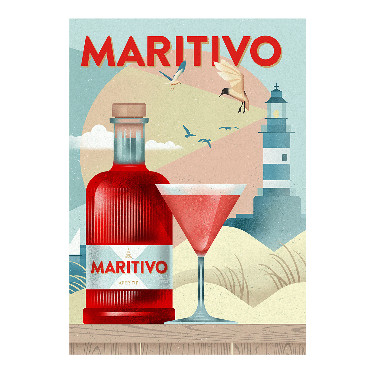 Dieses stimmungsvolle Werbeposter im Retro Look entwarf Dieter Braun im Auftrag von Spirit of Hafencity für den leckeren Aperitif „MARITIVO“.