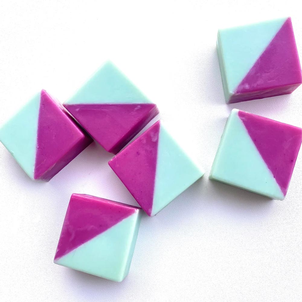 Diese vegane Seife besteht aus zwei markanten Dreiecken in Türkis und leuchtendem Lila und verzaubert mit einem angenehm frischen Duft aus Limone und Rosmarin – nicht zu süß, aber wunderbar erfrischend. Ideal für die tägliche Pflege normaler Haut und ein echter Hingucker in der Seifenschale.