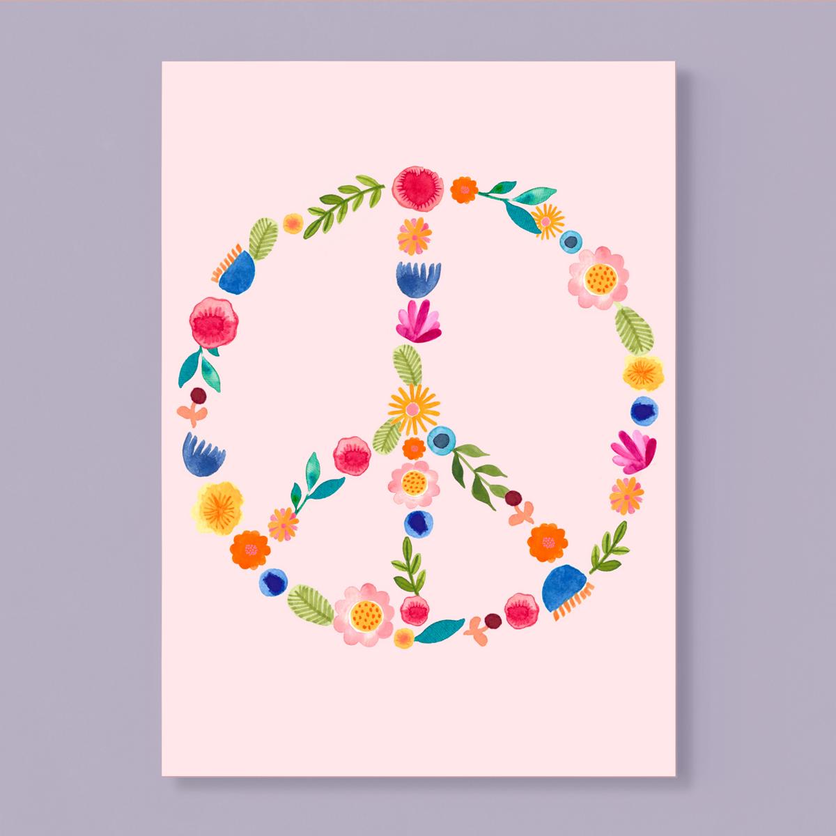Wunderschöner Print mit liebevoll illustriertem Peace Zeichen aus Blumen in DIN A3 von Frau Ottilie. Ein perfektes Poster für große und kleine Leute, die Blumen lieben mit positiver Botschaft.